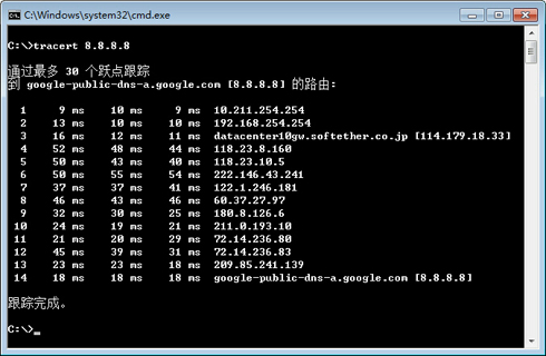 当 VPN 建立时,所有到互联网的通讯将通过 VPN 服务器转发。您可以在 Windows 命令提示中使用 "tracert 8.8.8.8" 命令验证。